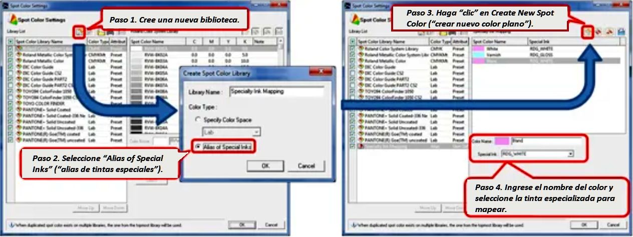 ¿Por qué es esto importante? Es raro ver archivos que usen los nombres convencionales que les damos a las tintas especializadas. Por ejemplo, el color plano en el archivo de diseño puede tener el nombre “silver” (“plata”) cuando VersaWorks® conoce el color deseado como “metallic silver” (“plata metalizada”). Para cerrar esta brecha, usted puede ahora crear su propia biblioteca personalizada que mapee cualquier color plano designado a una de nuestras tintas especiales. Esta función puede hacerle ahorrar mucho tiempo al permitirle hacer desde VersaWorks® todos los cambios importantes en el archivo sin una preparación adicional.