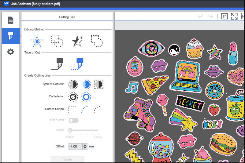 DG Connect Designer can also be used to edit cut lines on imported pdf files. This feature is especially useful as it simplifies the cut settings significantly compared to other design programs. You can draw and merge cut lines, determine the type of cut, and amend various other useful options.