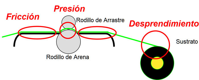 La estática puede ser causada por un número de fuentes, incluyendo la fricción del sustrato que se desplaza a través de la placa, la presión donde el sustrato se mueve entre los rodillos de arrastre y arena, y el desprendimiento del sustrato cuando se va desenrollando.