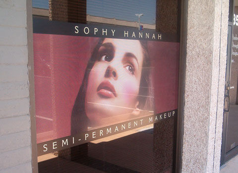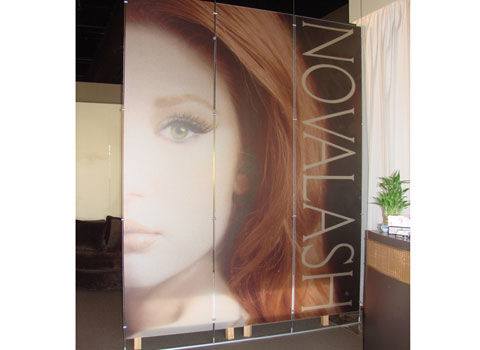 Jamie, la diseñadora gráfica de Virtuoso, sugirió utilizar la cara de una modelo (conocida como la “chica Novalash”) en un panel acrílico translúcido suspendido del cielo raso. Para conseguir el efecto semiopaco deseado, Thomas utilizo vinilo mate Avery Sparkle Crystal para imprimir tres paneles con la cara del modelo, cada uno de 32” de ancho y 10’ de largo. Él luego le aplicó el vinilo al acrílico de 3/16”. En el lado opuesto, él aplicó vinilo mate sin imprimir. Esa aplicación en ambos lados permitió que el lugar mantuviera un aspecto luminoso y aireado, y dividir el espacio en 2 áreas de trabajo distintas. Thomas terminó el trabajo al instalar el panel divisorio utilizando un sistema de exhibidor Mustang suspendido con cable, con un riel en el piso para mantenerlo alineado. “Mi cliente quedó encantada,” dijo Thomas. “Ellos hicieron un pedido de otros dos paneles.”