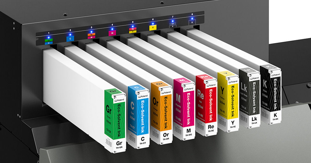 Solvent inks consist of pigments suspended in an oil-based solution. True solvent ink is high in VOCs (volatile organic compounds) and often results in an output with a noticeable odor. Eco-solvent ink, on the other hand, uses refined oil extracts which deliver several benefits, being biodegradable, low in VOCs and suitable for a wide variety of applications. Roland DG offers several types of eco-solvent inks: TH inks for the TrueVIS XP-640, TR3 inks for the TrueVIS XG-640, and TR2 inks for the TrueVIS VG3 series printer/cutters.