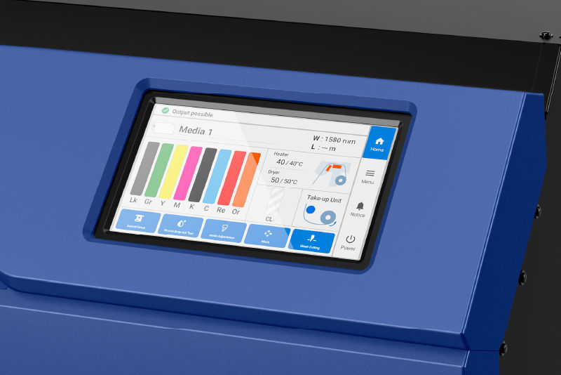 - Una operación más inteligente día tras día: la intuitiva pantalla táctil de 7 plg, además de la Impresión Directa, le permite iniciar trabajos desde la misma impresora después de la configuración desde el software RIP.
