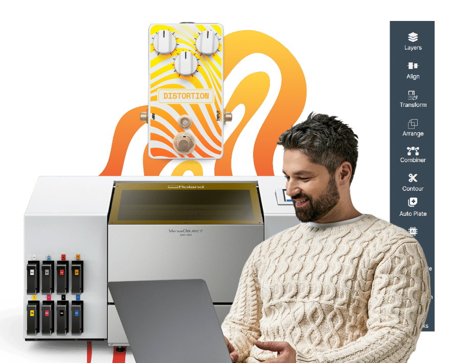 Aplique efectos específicos a la impresora tales como relieves, colores UV planos, y más directamente dentro de sus archivos de diseño, liberando todo el poder de su Impresora Roland DG. Compatible con todas las impresoras Roland DG funcionando con el software VersaWorks® 7.