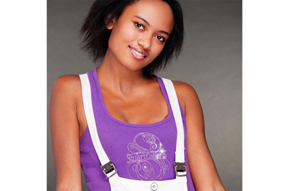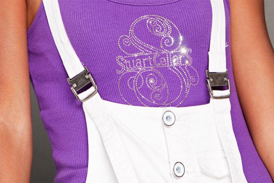 To create a design in rhinestones, Marilyn begins by drawing or importing a scanned design in Adobe Illustrator, then exports the design into R-Wear Studio, Roland DG’s rhinestone design software solution. The software creates a rhinestone pattern based on the specified stone size and desired distance between stones. Next, R-Wear generates a 3D preview of the tool path. At this point, Marilyn makes any minor adjustments needed, then takes a snapshot of her screen and sends it to the client for approval. Once the design is approved, it is output to the EGX-350 and engraved on a template. A special brush allows Marilyn to easily insert the stones into the template, then lift them using transfer tape. To finish the garment, Marilyn applies the transfer using a heat press.
