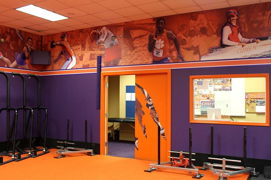 CB&D también produce gráficos de paredes, pancartas y letreros para los equipos de tenis, fútbol y béisbol. Ellos diseñaron, produjeron e instalaron 46 m2 de gráficos de pared para la sala Olímpica de pesas del campus. También producen e instalan rotulaciones de vehículos para autos, buses pequeños, e incluso carritos de golf de la universidad.
